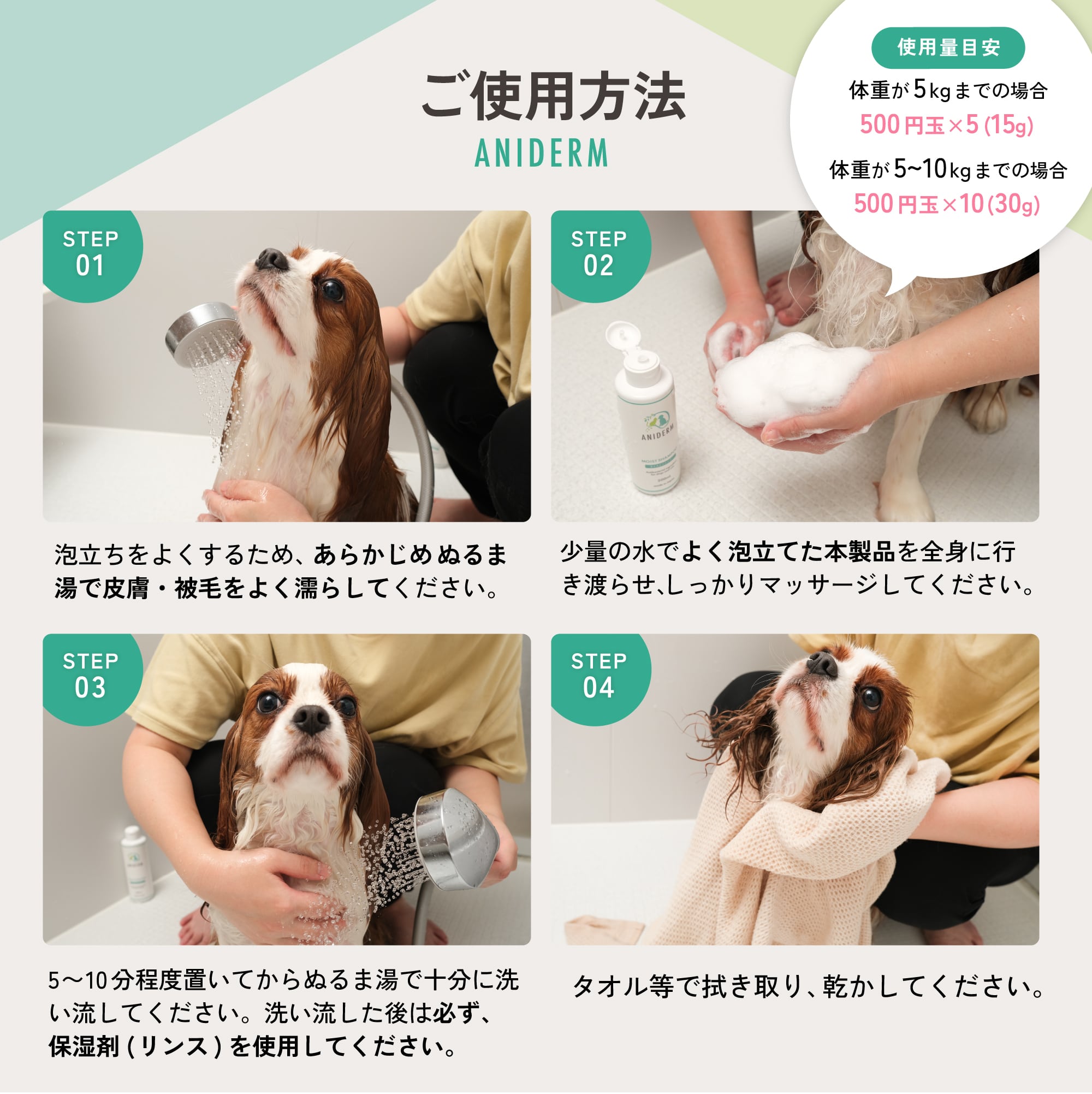 さらに、皮膚バリア機能をサポートする成分も配合しており、日々のシャンプーによるダメージを軽減します。愛犬の肌を大切に守るために、ANIDERM モイストシャンプーをお試しください!