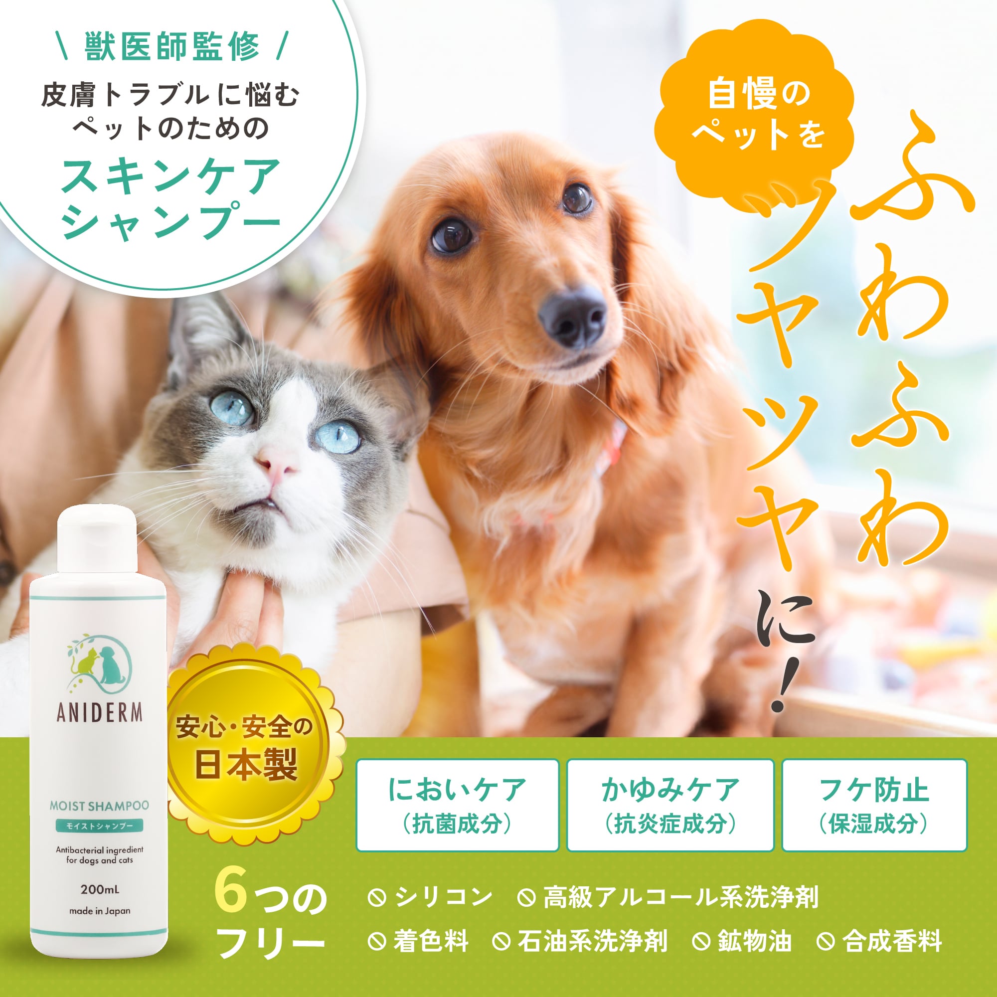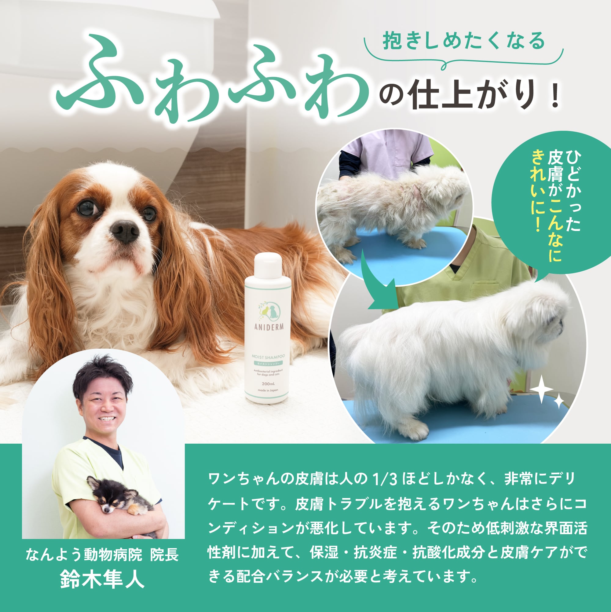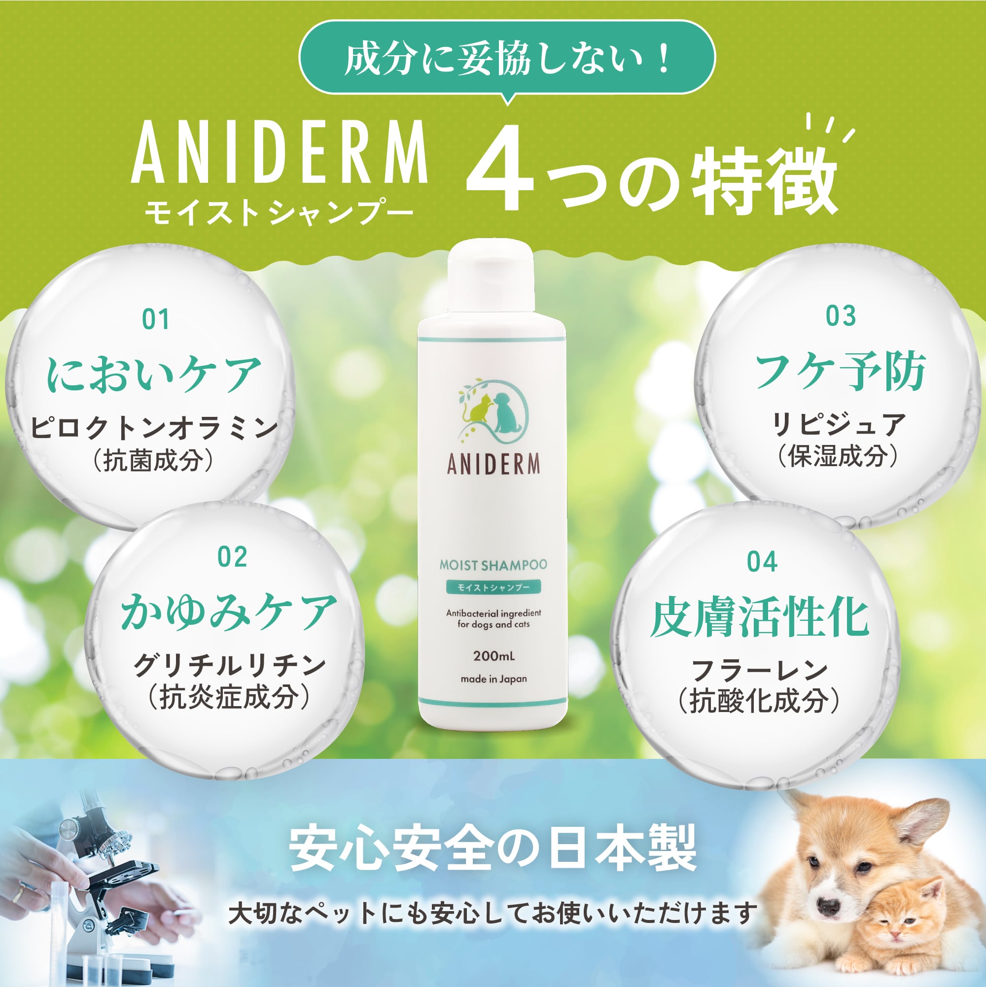 そこで、ペットの皮膚病に本気で向き合うために、自ら研究・開発に乗り出し誕生したのが、このモイストシャンプーです。皮膚をケアする成分をバランス良く配合し、それぞれが相乗効果を発揮できるよう丁寧に処方しました。一般的なシャンプーでは落としきれなかった菌をしっかりと洗い流しつつ、皮膚のバリア機能をサポートする保湿成分が優しく働きかける――こうして、ペットのデリケートな肌を守りながら清潔で健康な状態へと導きます。