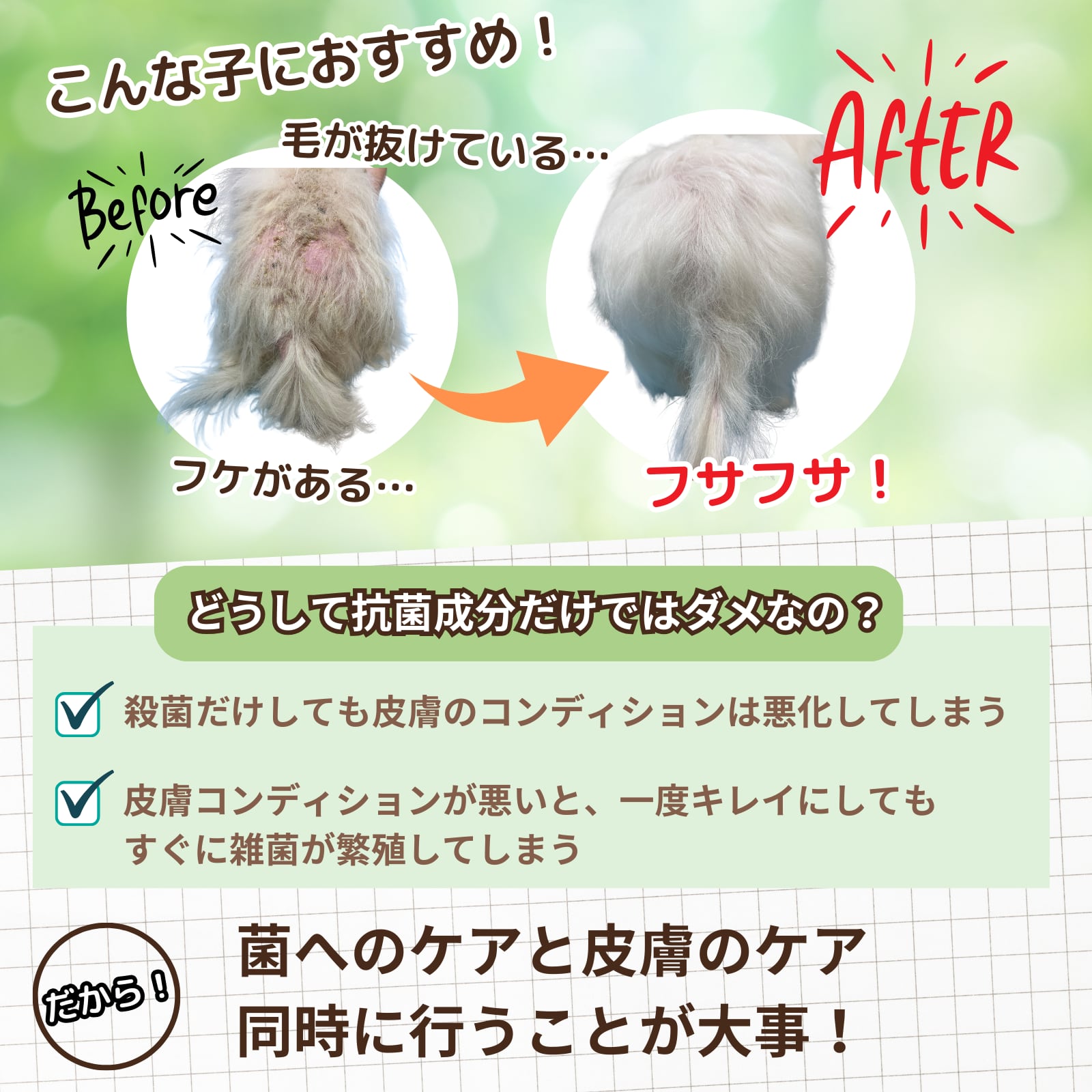 私たちは、ペットと暮らす飼い主さんのQOL(クオリティ・オブ・ライフ)がより向上していくことを心から願っています。皮膚病に悩むペットはもちろん、そんなペットを思い悩む飼い主さんも笑顔になってほしい。そのためにも、より多くの方々にこの製品を知っていただき、お試しいただきたいと考えています。ペットのケアを充実させ、飼い主さんとの大切な時間を健康で明るいものに、私たちのシャンプーがその一助となれることを願ってやみません。
