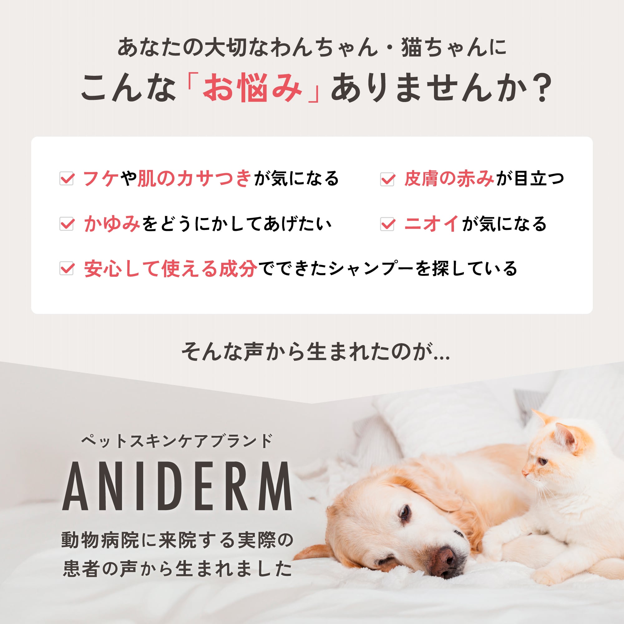 この状況をなんとか変えたいと奮闘しているのが、現役の獣医師であるANIDERMの開発者です。開業以来、数えきれないほど多くのペットを診察し、なかでも皮膚病に苦しむワンちゃん・ネコちゃんの多さを肌で感じてきました。診療の現場では市販のスキンケア製品を試すことも多いのですが、「ここがもう少し改善されていれば」「この成分がもう少し豊富に配合されていれば」と、どうしても物足りなさを感じていました。